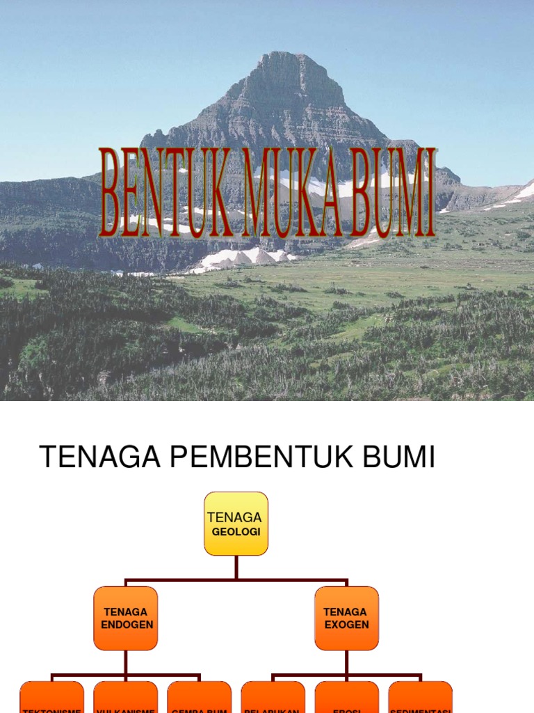 Bumi tersusun atas tiga lapisan utama: Definisi bentuk muka bumi sbagai kenampakan alam (permukaan bumi) yang kita lihat secara langsung dengan mata kita. Perbukitan ini 4 gunung gunung adalah bentuk muka bumi yang menonojol tinggi ke atas seperti kerucut. Tenaga endogen adalah tenaga pengubah muka bumi yang berasal dari dalam bumi. Jika magma bergerak ke luar dari dapur magma ke permukaan melalui lubang kepundan (volcanic form).